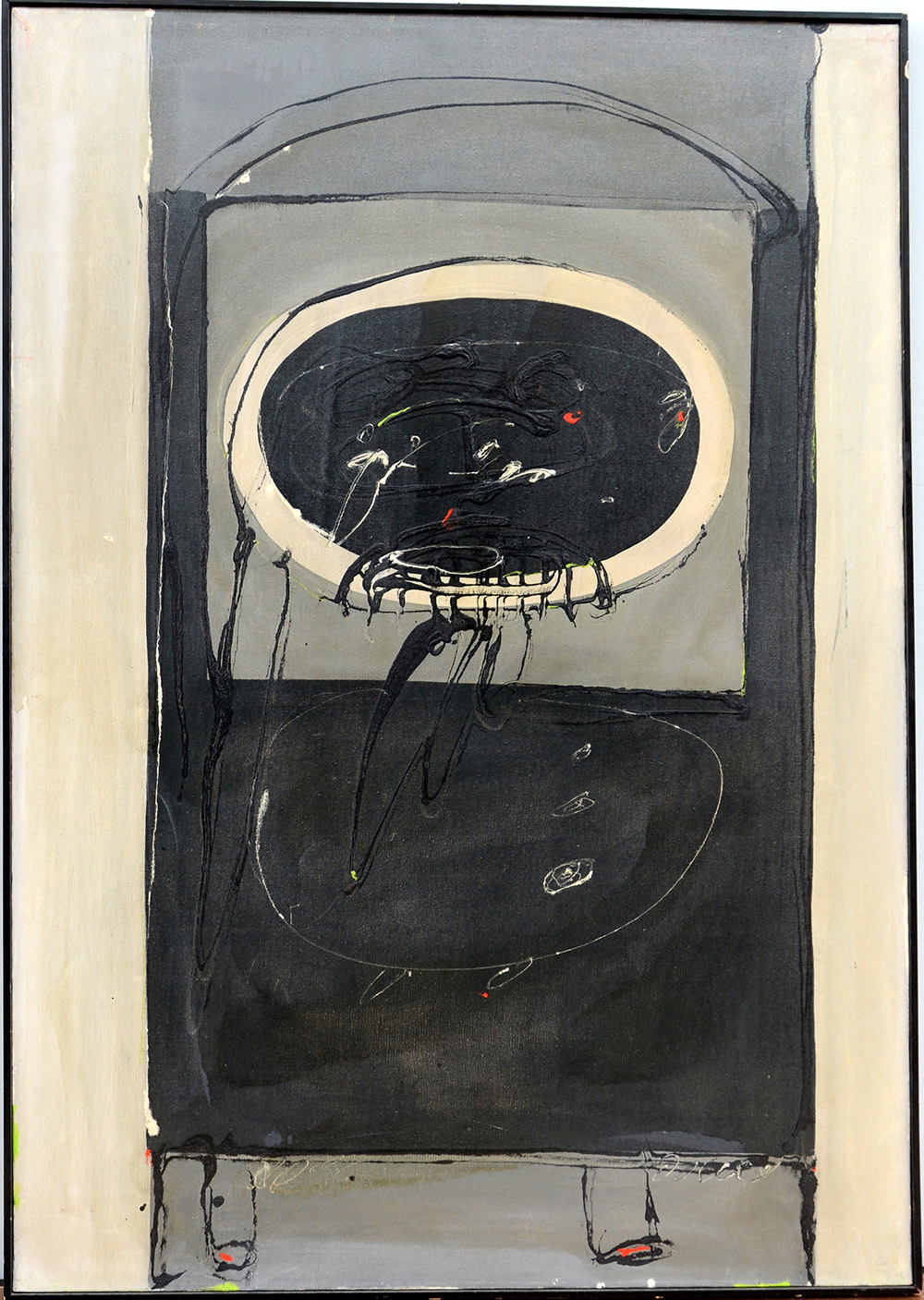 Firma indecifrata "Troppo crudo per essere cotto. Primo tentativo di non fare più ceramica" 1964, tecnica mista su tela (cm 100x70). Titolato, datato, iscritto e siglato al retro, in cornice (lievi difetti)