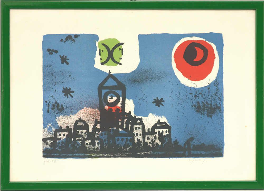 Franco Rognoni (Milano 1913 - 1999) "Senza titolo" litografia a colori - prova d'artista (foglio cm 49,5x69,5) iscritto e firmato in basso a matita, in cornice (lievi difetti)