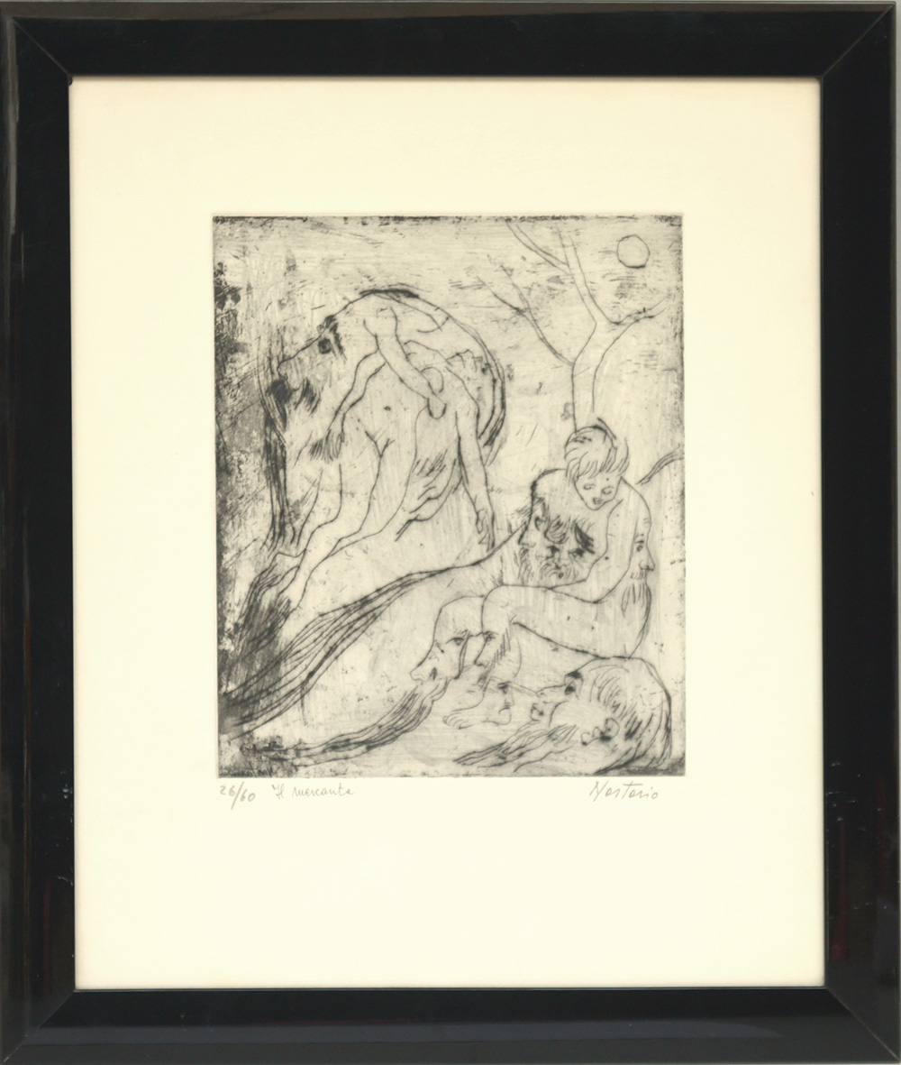 Alessandro Nastasio (Milano 1934) "Il mercante" acquaforte (lastra cm 29x24,5; foglio cm 47x39) numerata 26/60, titolata e firmata in basso a matita, in cornice