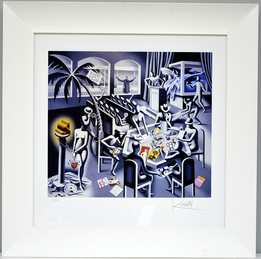 Kostabi Mark (Los Angeles 1960) "Senza titolo" litografia a colori (foglio cm 59x58,5) numerata 30/ 50 e firmata in basso a matita, in cornice