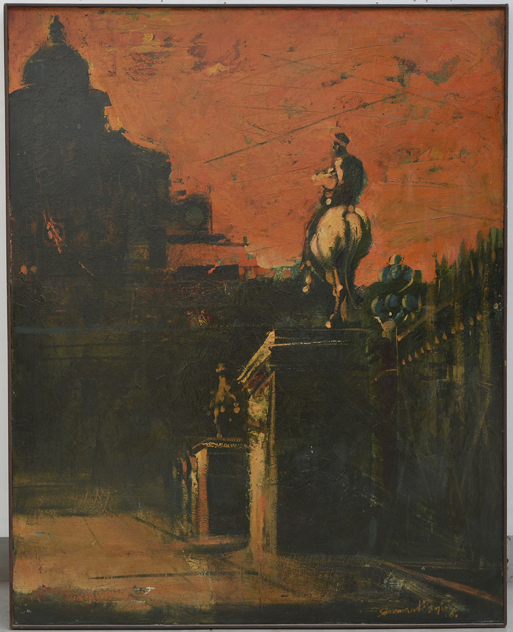 Sergio Saccomandi (Torino 1946) "Piazza Castello" olio su tela (cm 150x120) firmato e datato in basso a destra, in cornice (lievi difetti)