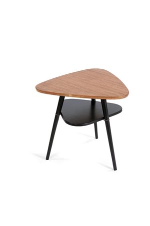 Tavolino triangolare in legno di teak con gambe smontabili e piano inferiore in legno laccato nero.
