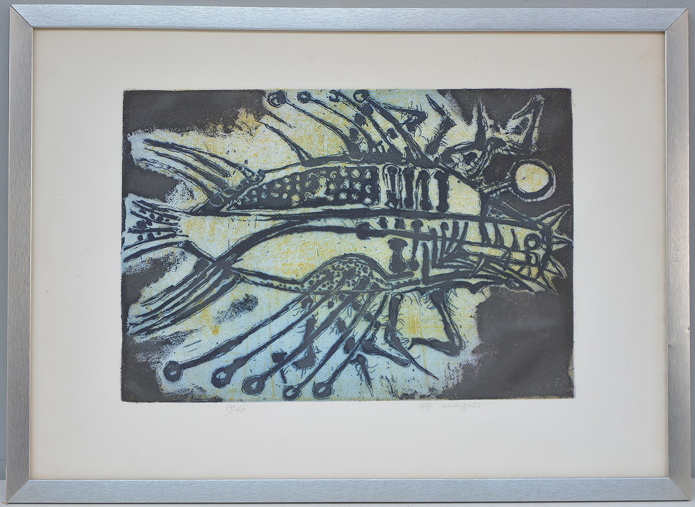 Luciano Minguzzi (Bologna 1911 - Milano 2004) "Senza titolo" acquaforte a colori (cm 50x70) firmata, monogrammata e numerata 130/150 in basso a matita, in cornice (lievi difetti)