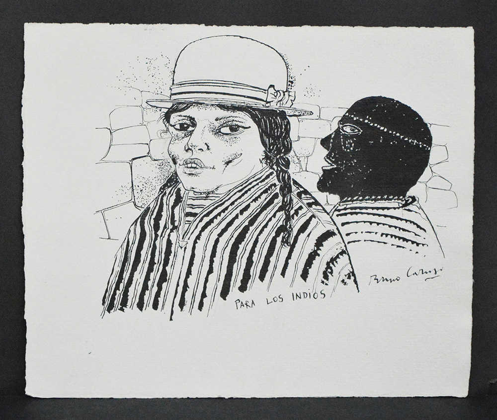 Bruno Caruso (Palermo 1927) "Para los Indios" china su cartoncino (cm 28x33,5) titolato e firmato in basso nella composizione. Traccia di disegno al retro.