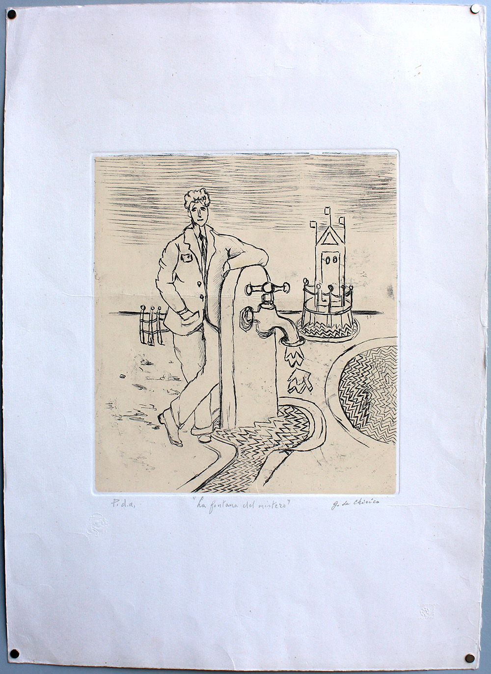 Giorgio De Chirico (Volos 1888 - Roma 1978) "La fontana del mistero" 1971, litografia (foglio cm 70x50). Firmata, titolata e numerata P.d.A. in basso a matita. Timbro a secco "Alberto Caprini Stampatore in Roma" in basso a destra e timbro a secco in basso a sinistra "GdeC". Edizioni Bora (etichetta al retro)