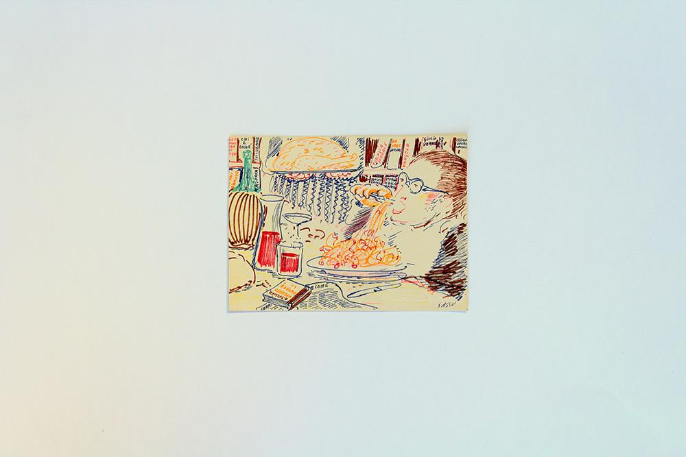 Aligi Sassu (Milano 1912 - Palma De Mallorca 2000) biglietto di auguri - pennarelli su carta (cm 11x14,7) firmato in basso a destra e dedicato al retro.