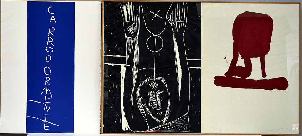 Mimmo Paladino (Paduli 1948) "Carro dormiente" (dittico) 1986, xilografia e litografia - prova d'artista (foglio cm 79x119). Firmata, iscritta e numerata 6/10 in basso a destra a matita. In cornice (lievi difetti). Edizione a cura di Bernd Kluserm Monaco e stampata da Giorgio Upiglio-Grafica Uno, Milano. Opera accompagnata da cartelletta originale con titolo della grafica serigrafato. Opera facente parte del portfolio "For Joseph Beuys". Bibliografia: Enzo Di Martino "Paladino. Graphic Work 1974 - 2001" New York, Rizzoli, 2002, pp. 106 - 107, ill.