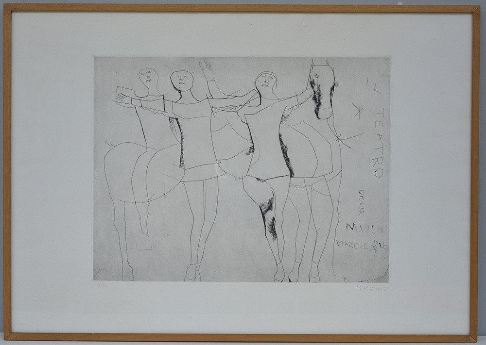 Marino Marini (Pistoia 1901 - Viareggio 1980) "Il teatro delle maschere" acquaforte (lastra cm 49x64,5; foglio cm 69,5x98,5)titolata in lastra sul lato destro e siglata M in lastra in basso a sinistra. Numerata 59/75 e firmata in basso a matita. Timbro a secco "Il Cigno - Stamperia d'Arte" in basso a destra, in cornice.