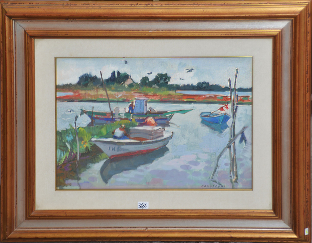Silvio Consadori (Brescia 1909 - Burano 1994) "Laguna di Grado" tecnica mista su cartone (cm 36x50) firmato in basso a destra. Titolato e firmato al retro, in cornice