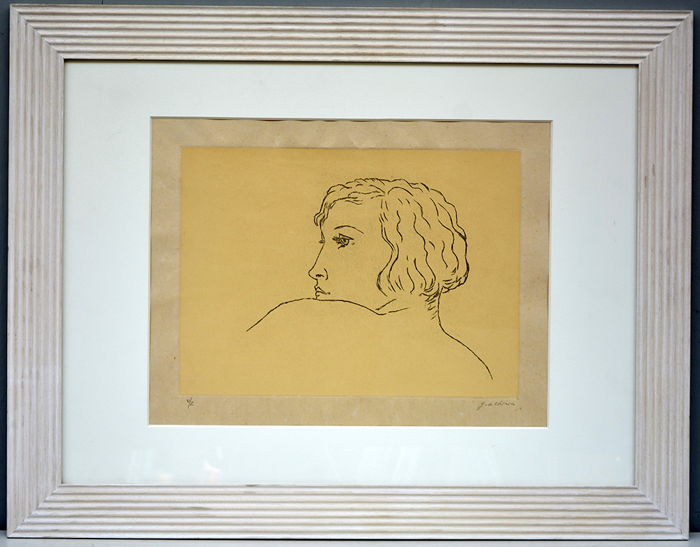 Giorgio De Chirico (Volos 1888 - Roma 1978) "Profilo di donna" 1971, incisione a vernice molle su fondo colorato applicato su carta giapponese (foglio cm 50,5x70) numerata V/Z e firmata in basso a matita. Timbro a secco "G. De C." in basso a sinistra. In cornice (lievi difetti)