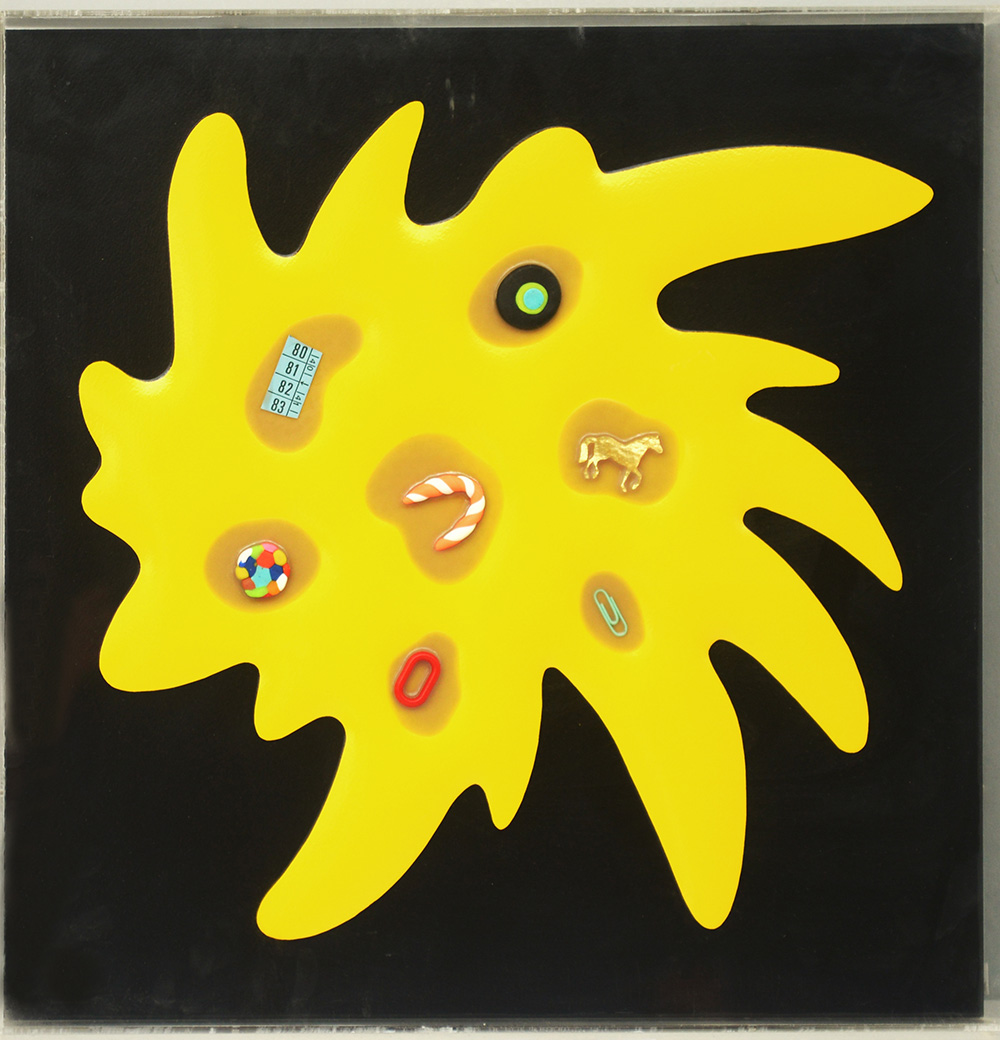 Renzo Nucara (Crema 1955) "Bang 10 (-37)", 2011 legno, carta, colore serigrafico, resine, oggetti (cm 50x50). Firma e numero di archiviazione al retro, in teca di plexiglass. Opera accompagnata da certificato di autenticità su fotografia firmato dall'artista (n. 0114204) del 28/10/2011