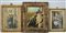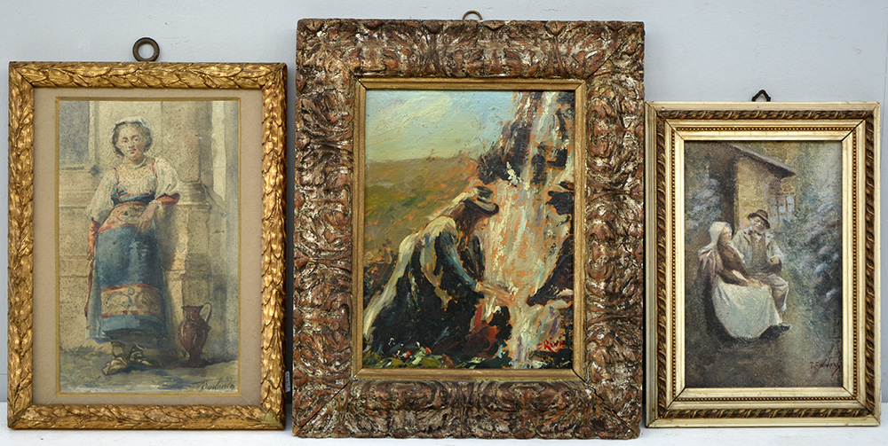 Lotto di due acquerelli ed un olio su cartone raffiguranti personaggi, autori e misure differenti, in cornici (difetti)