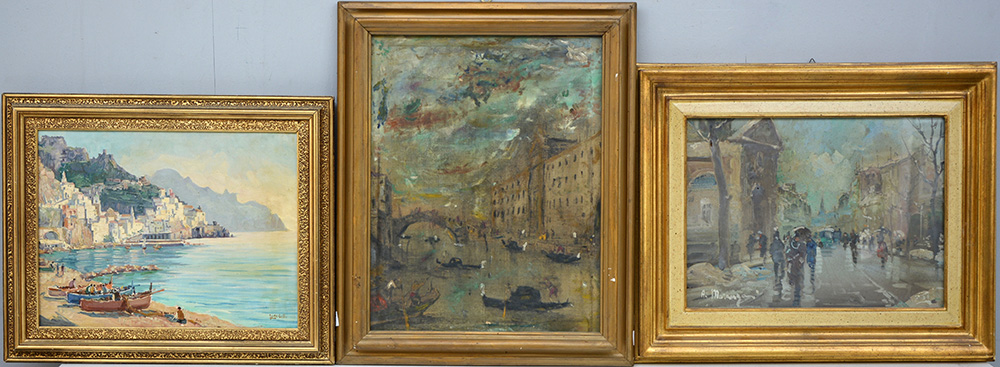 Lotto di tre dipinti ad olio su tela raffiguranti paesaggi, autori e misure differenti, in cornici (difetti)