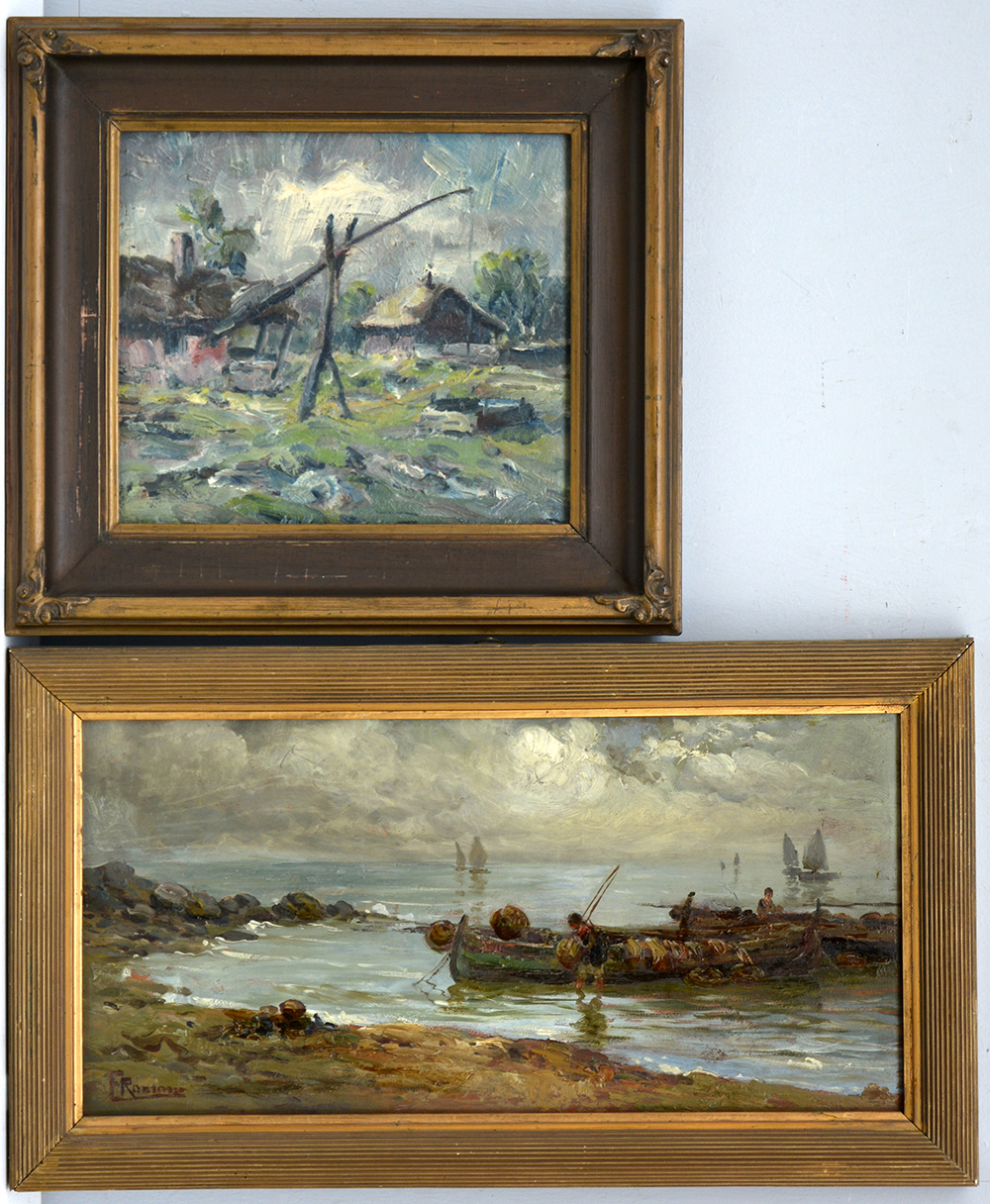 Lotto di due olii raffiguranti pescherecci e un paesaggio agreste, autori e...