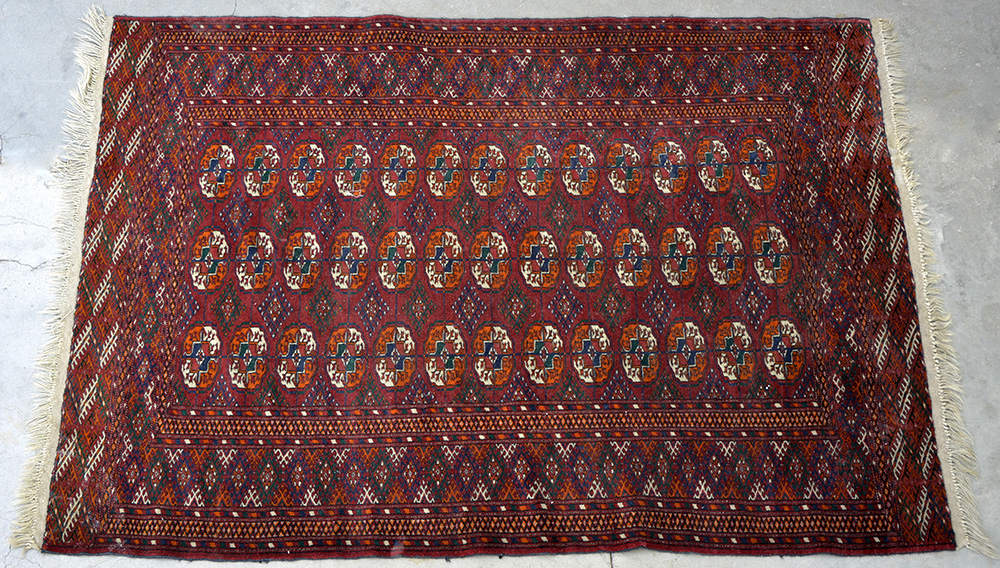 Tappeto Bohukara, Turkestan occidentale secolo XX Disegno a gul su fondo rosso (cm 176x128) (lievi difetti)