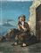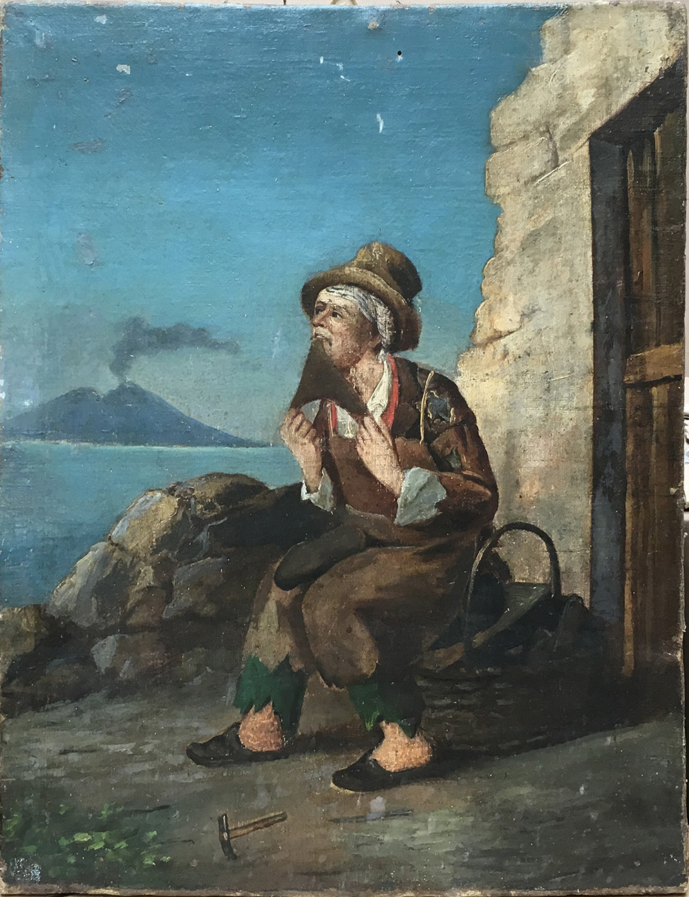 Ignoto "Ciabattino con Vesuvio sullo sfondo" olio su tela (cm 48x39)(difetti e restauri)