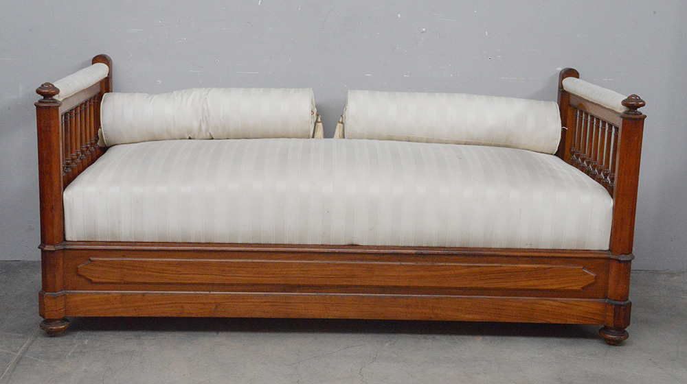 Ottomana in legno con decoro a bugne e fianchi a ringhiera, seduta e cuscini a cilindro rivestiti in tessuto color champagne (cm 192x85x84) (difetti)