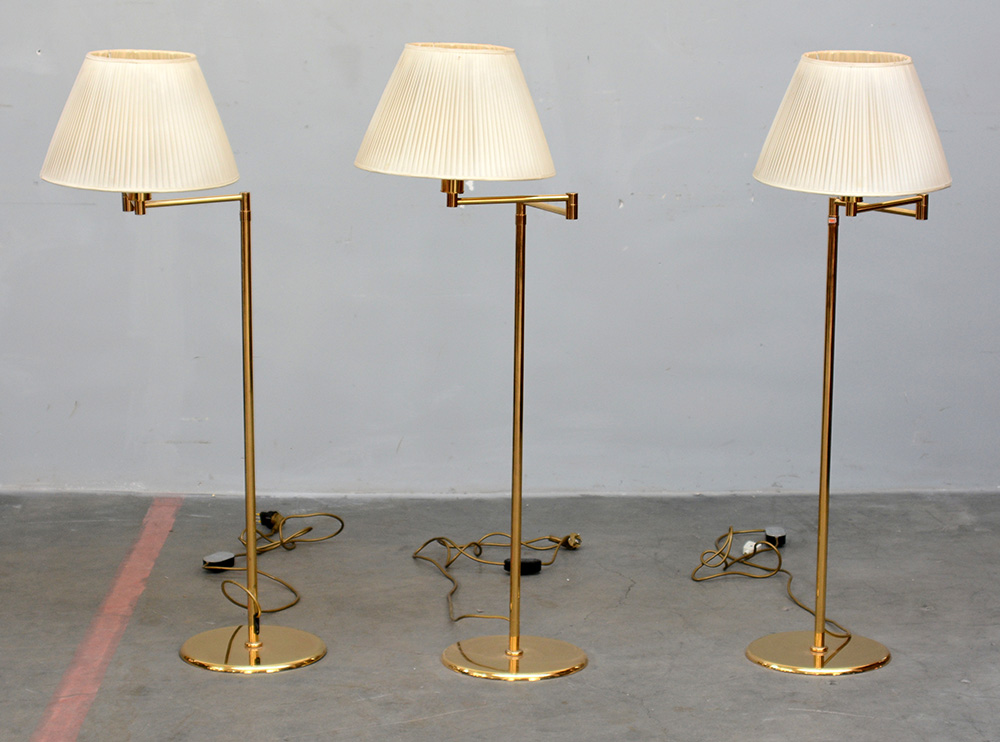 Gruppo di tre lampade da terra in ottone con braccia snodabili ed altezze regolabili (difetti)