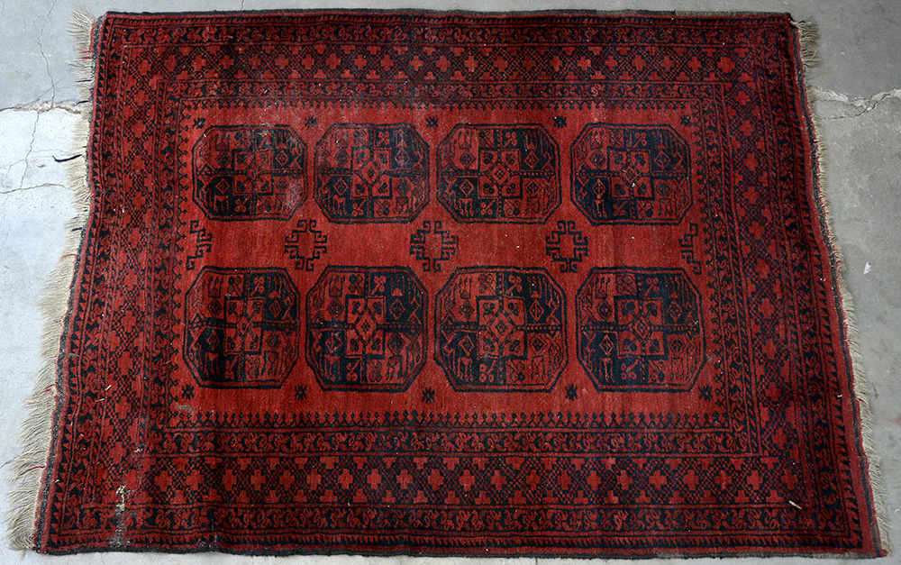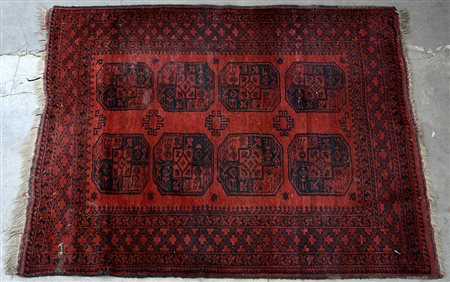 Tappeto Afghan, Turkestan occidentale fine secolo XIX Disegno a zampa di elefante su fondo rosso (cm 195x155) (difetti)