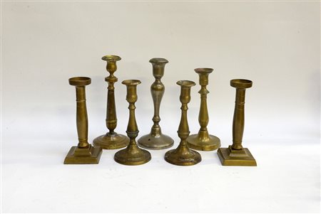 Lotto composto da sette candelieri in metallo (h max cm 24) (difetti)