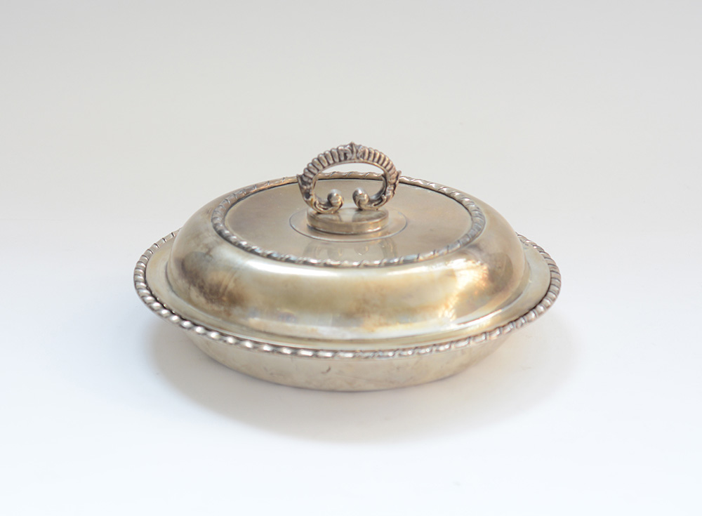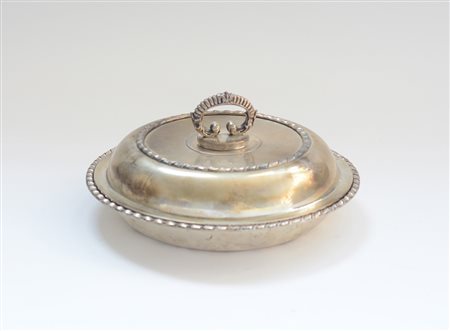 Legumiera tonda in argento con coperchio decorata da cordonature (g 1000 ca.) (d cm 23,5) (lievi difetti)
