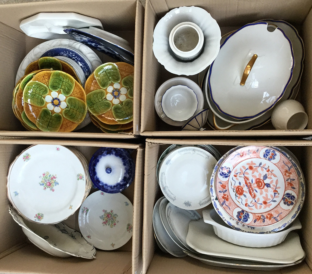 Lotto di quattro cartoni contenenti numerosi piatti e contenitori per la tavola (difetti)