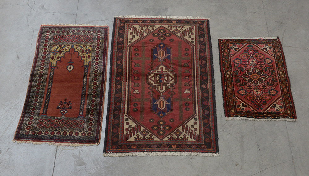 Lotto composto da tre tappeti orientali, decorati con motivi geometrici nel tono del rosso giallo e arancio, uno a preghiera (il più grande cm 154x108) (difetti)