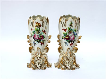 Manifattura francese del secolo XIX, coppia di vasetti portafiori in porcellana decorata in policromia a fiori e fregi dorati (h cm 28) (difetti)