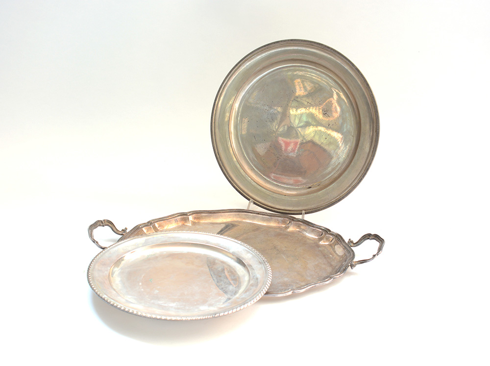 Lotto composto da un vassoio biansato e due tondi in argento di fatture differenti (g 1800 ca.) (d max cm 50) (lievi difetti)
