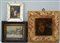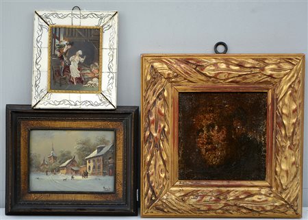 Lotto composto da due miniature raffiguranti un paesaggio e una scena galante, e un frammento di dipinto antico con testa di francescano, in cornici (difetti)