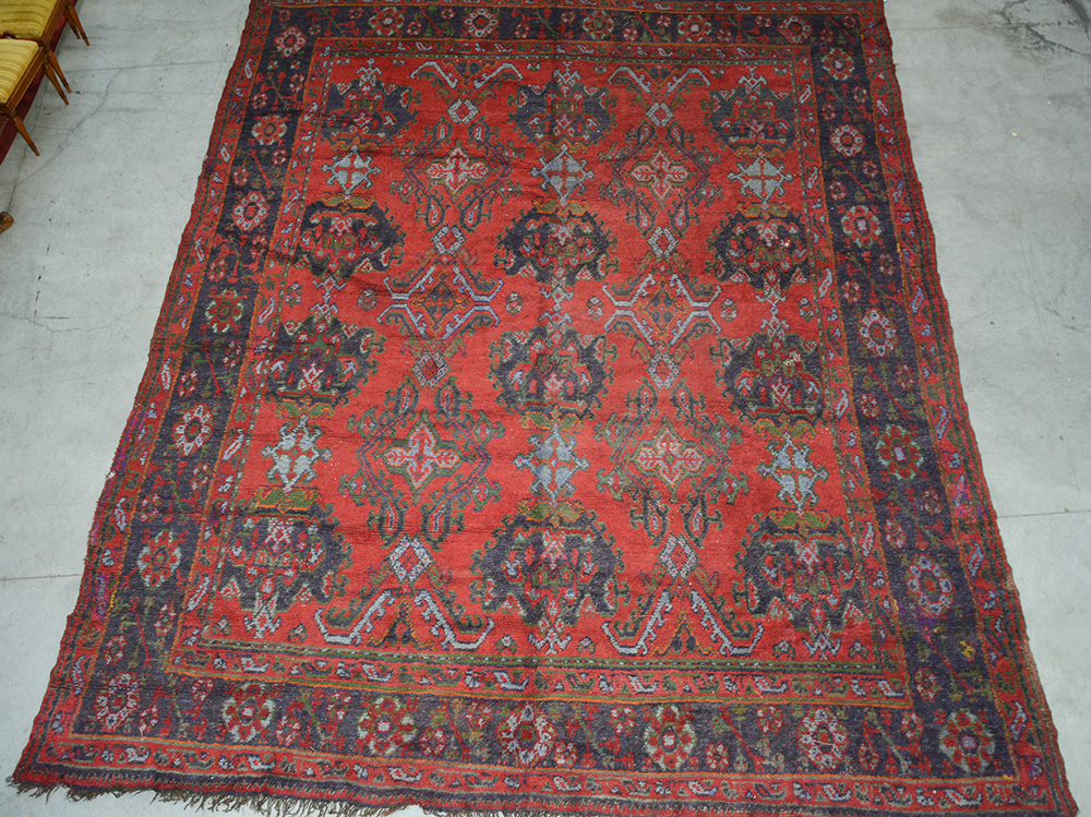 Tappeto Ushak, Anatolia sec. XX Decorato a medaglioni in stile ottomano su campo rosso (cm 500x400) (difetti, mancanze e vecchi restauri)