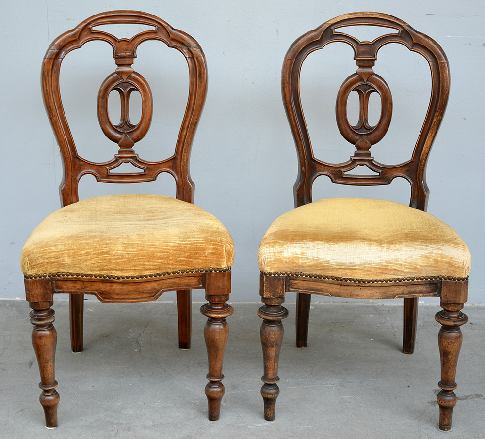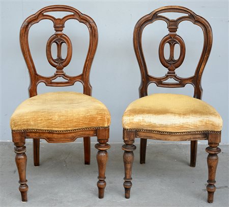 Coppia di sedie con schienale a giorno e cartella traforata. Gambe anteriori tornite, sec.XIX (difetti)