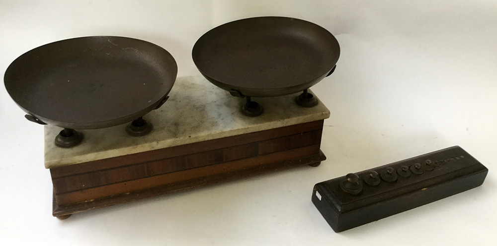 Lotto 4041 | Lotto composto da una bilancia per cucina e un set di pesi (difetti e mancanze)