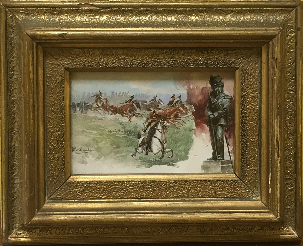 Scuola lombarda del secolo XIX “La carica della cavalleria” tecnica mista su carta applicata su cartoncino (cm 9x13;5) reca firma R. Pellegata in basso a sinistra, in cornice (difetti)