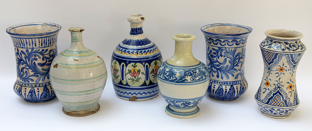 Lotto composto da tre bottiglie e tre albarelli di manifatture ed epoche diverse (difetti)