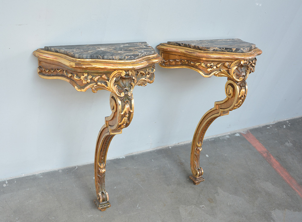 Coppia di consolles in legno intagliato e dorato a motivi vegetali. Piani in marmo (cm 46x72x30) (difetti e rotture)