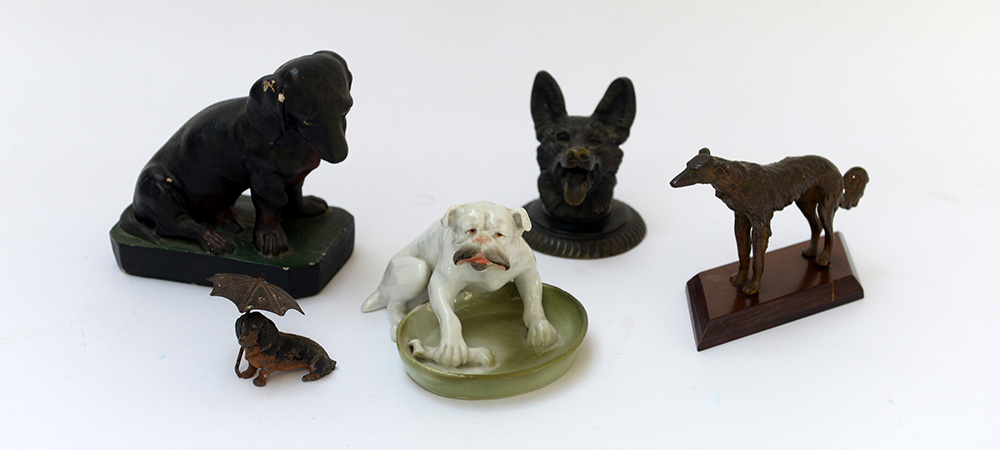 Manifatture diverse. Gruppo di cinque sculturine in bronzo e ceramica raffiguranti cani (difetti)