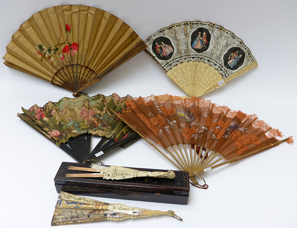 Lotto composto di sei ventagli di epoche diverse, uno in scatola di legno (gravi difetti)