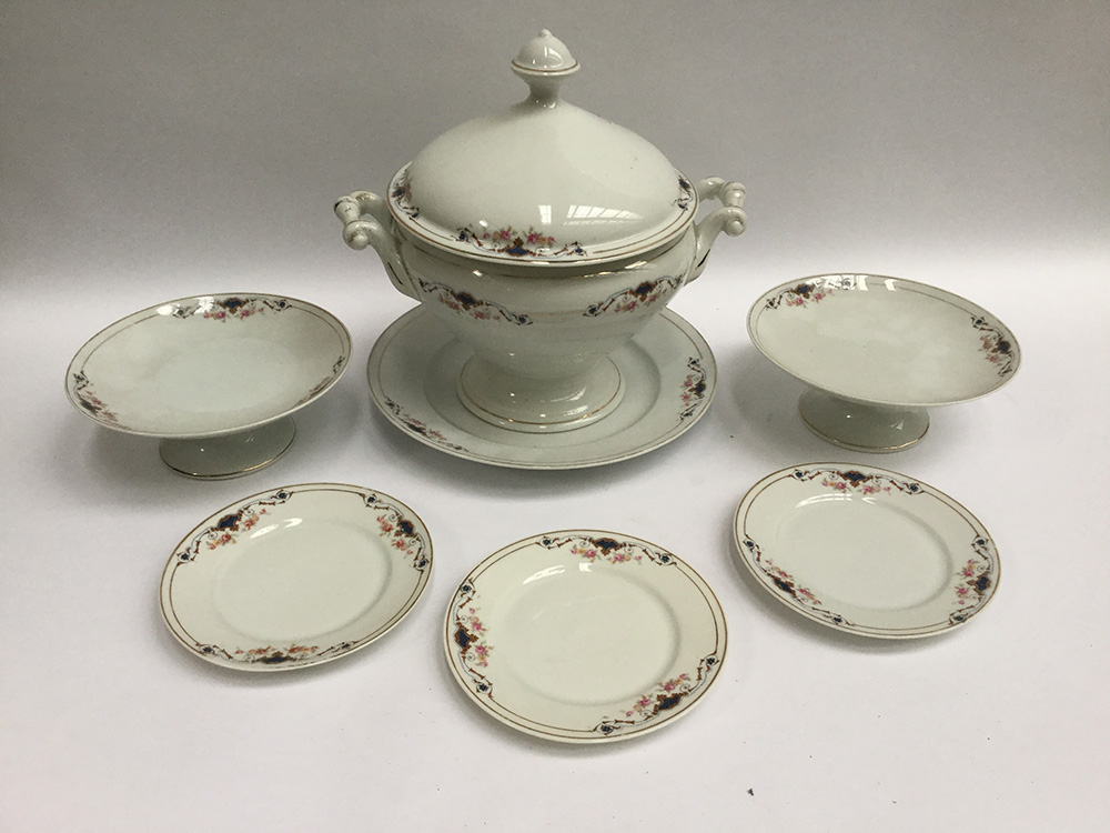 Manifattura tedesca KPM, servizio da tavola in porcellana con decoro floreale e geometrico composto da dodici piatti fondi, trentacinque piatti piani, dodici piatti da frutta, tre piatti da portata ovali e uno tondo, due raviere, una zuppiera con coperchio e due alzatine (lievi difetti)