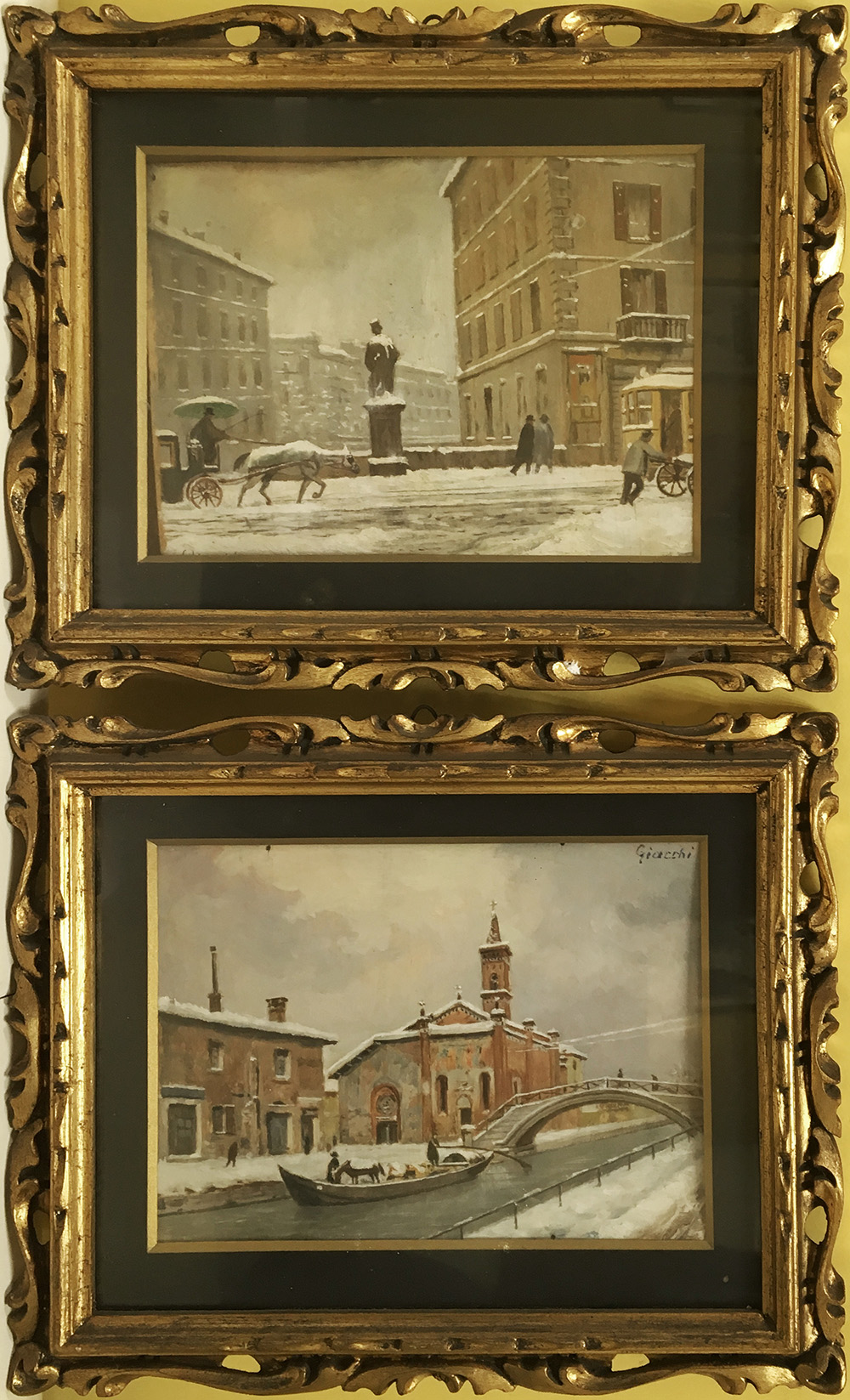 Ignoto "Scorci di Milano" coppia di dipinti ad olio su compensato(cm 18x25) recano firma Giacchi, in cornici (difetti)