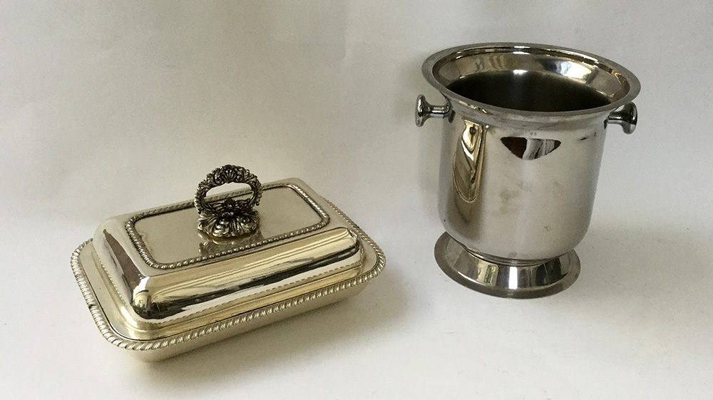 Lotto composto da un rinfresca bottiglie e una legumiera in metallo argentato (lievi difetti)