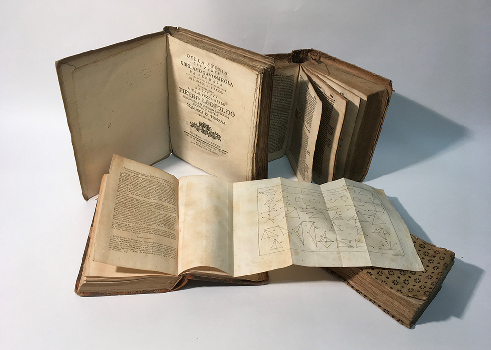 Lotto composto da diversi volumetti antichi tra cui: "Della storia del Padre Girolamo Savonarola da Ferrara [...]" Livorno: 1782 (difetti riscontrabili in ogni volume). 4 volumi.