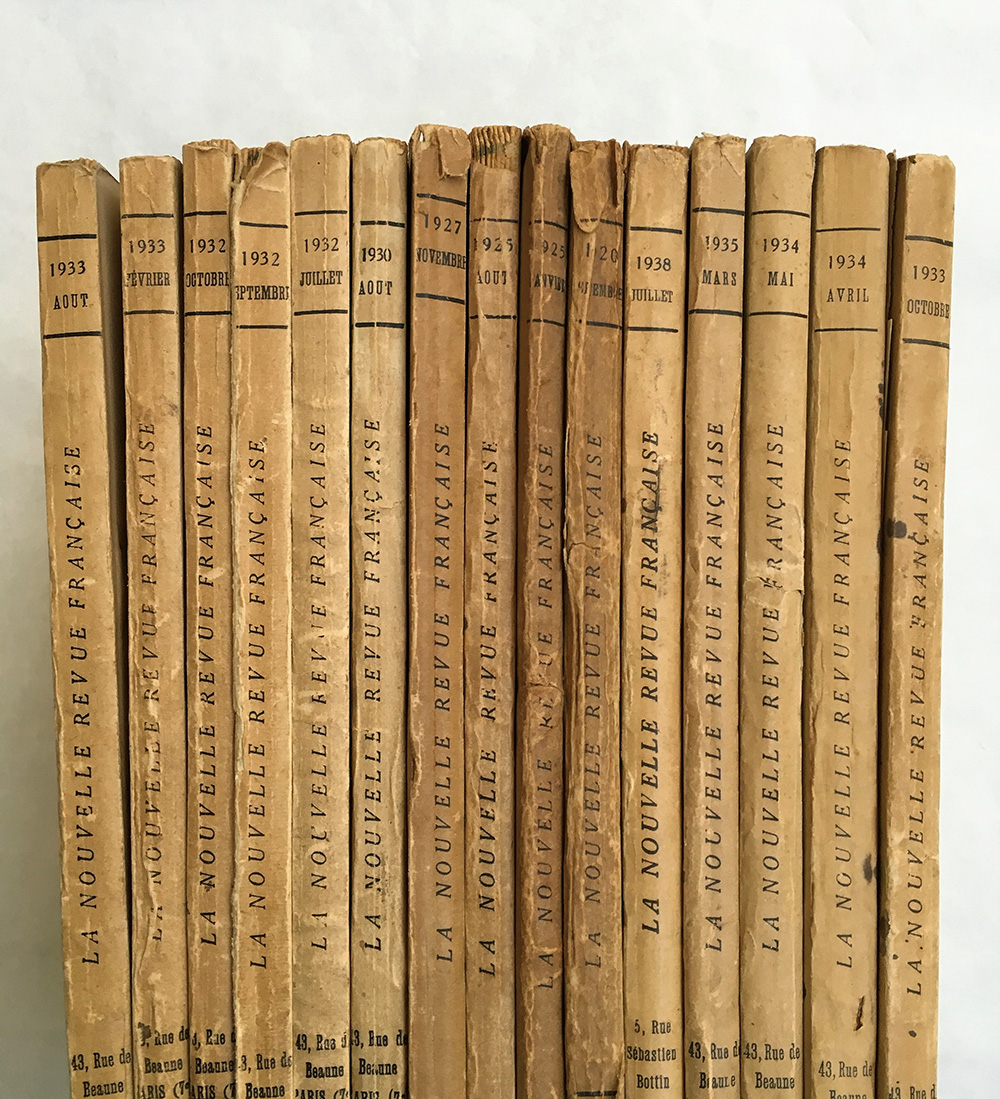 Lotto composto da 15 numeri de "La Nouvelle Revue Francaise" (1920-38), rilegati in brossura editoriale (difetti).