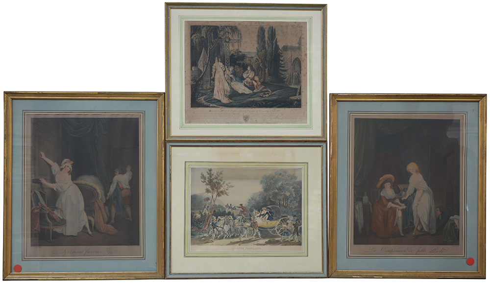 Lotto di quattro incisioni francesi a colori raffiguranti scene di genere, misure diverse, in cornici (difetti)