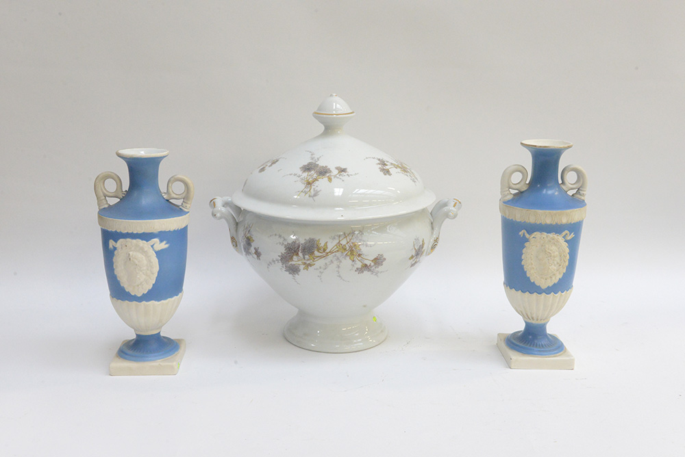 Lotto composto da una zuppiera con coperchio e due vasetti biansati a decoro...
