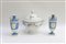 Lotto composto da una zuppiera con coperchio e due vasetti biansati a decoro bianco e blu (difetti)