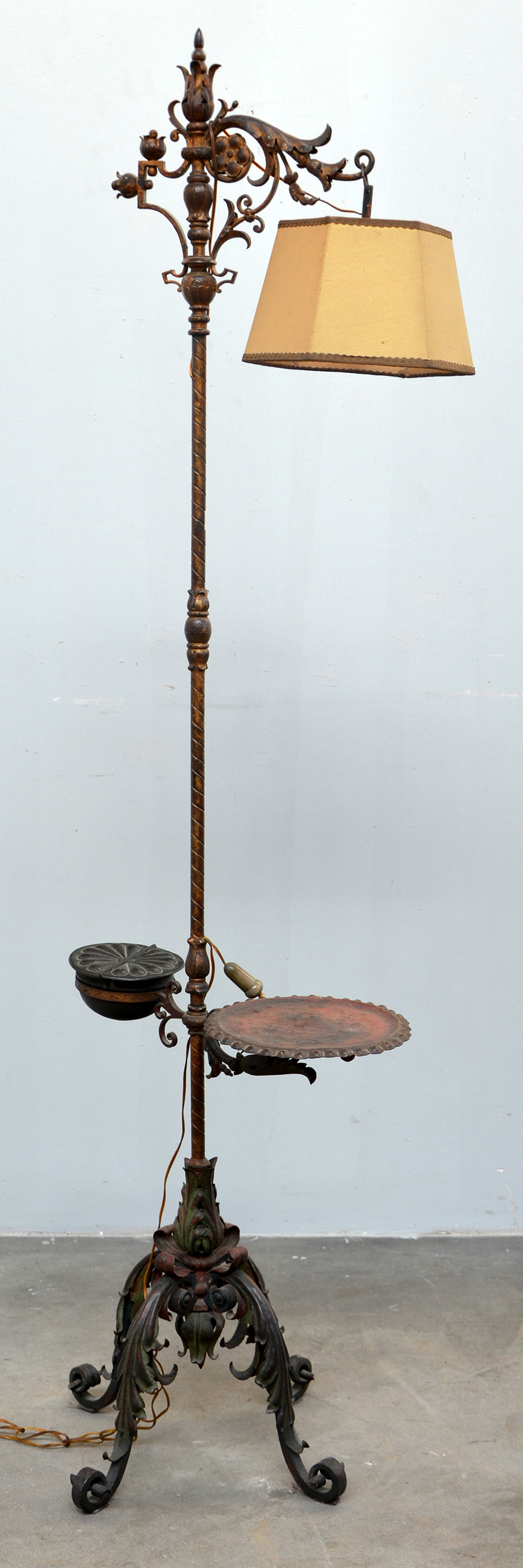 Piantana in ferro battuto dorato decorata a volute con pianeto e posacenere nella bse (h. cm 170) (difetti)
