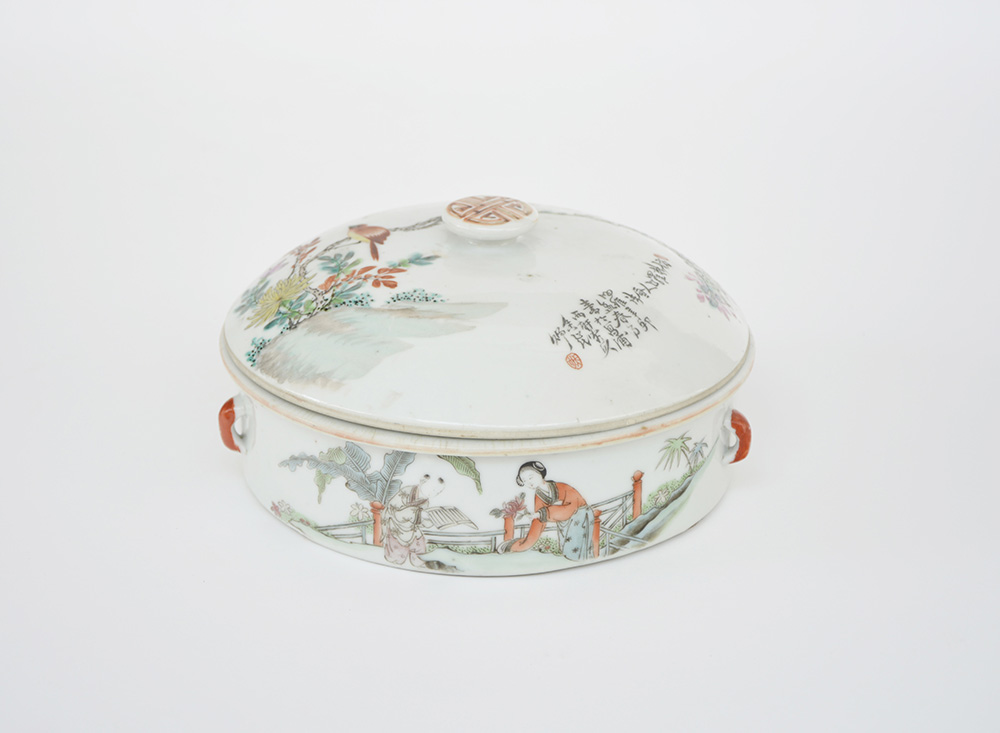 Ciotola con coperchio in porcellana Famiglia Rosa decorata con figure e calligrafia (d cm 19). Cina, sec. XX (difetti)