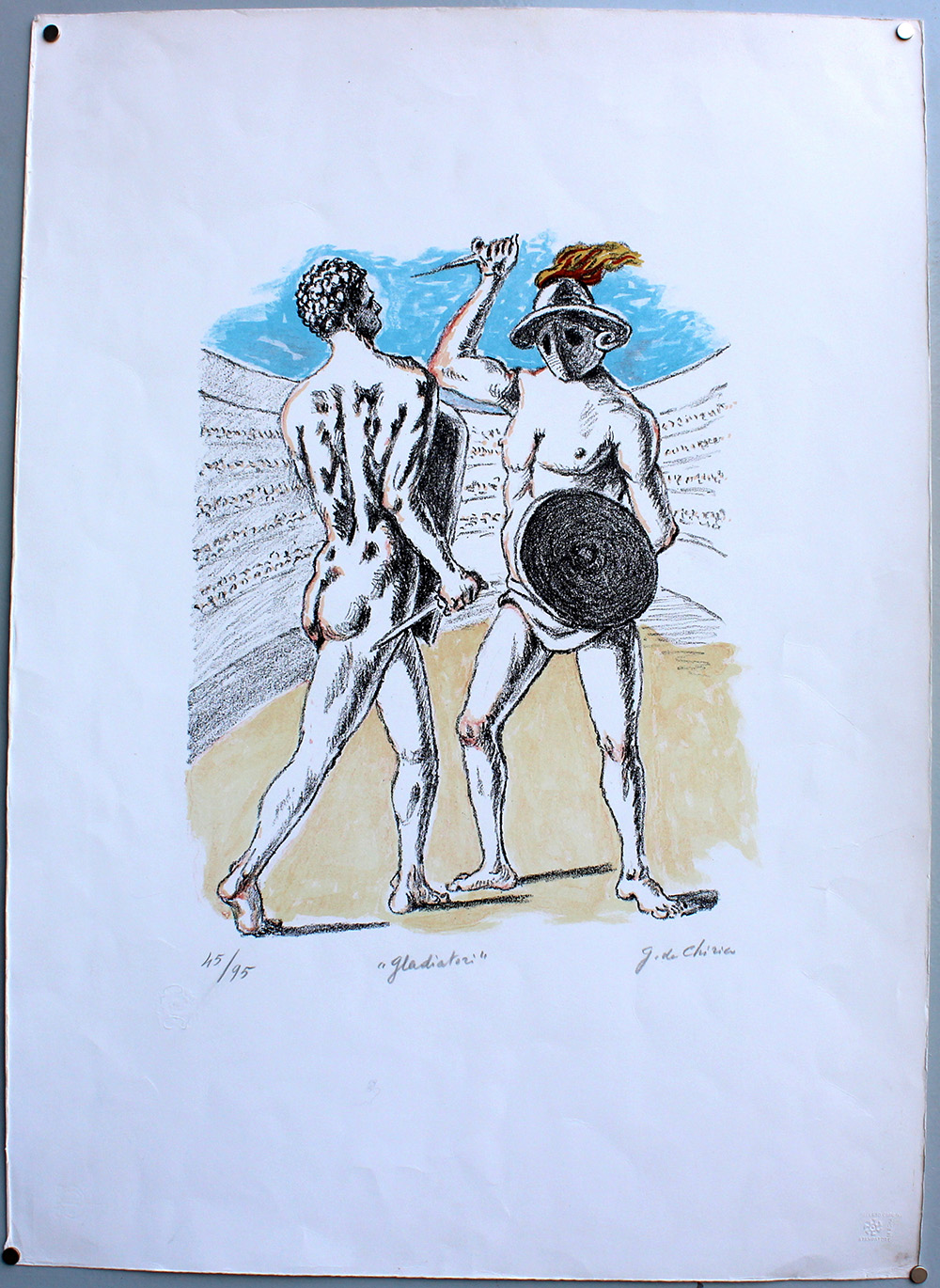 Giorgio De Chirico (Volos 1888 - Roma 1978) "Gladiatori" litografia a colori, cm 70x50 Firmata, titolata e numerata 45/95