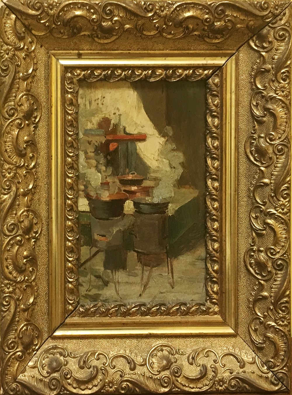 Maestro lombardo del secolo XIX "Interno con cucina" olio su cartone pressato (cm 23x14,5) in cornice